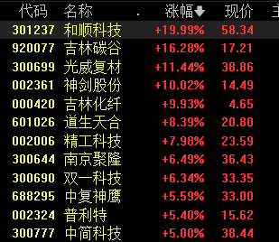 碳纤维概念盘初走高,和顺科技、吉林化纤双双涨停,光威复材、吉林碳谷、中复神鹰涨超10%。