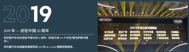 1998年,安利捷的丰田经销业务落地中国。2024年,一汽-丰田汽车销售年度经销商大会上,安利捷获得“杰出经销商团体”奖,该奖项从与一汽-丰田汽车销售合作的100多个经销商团体中评选而出。