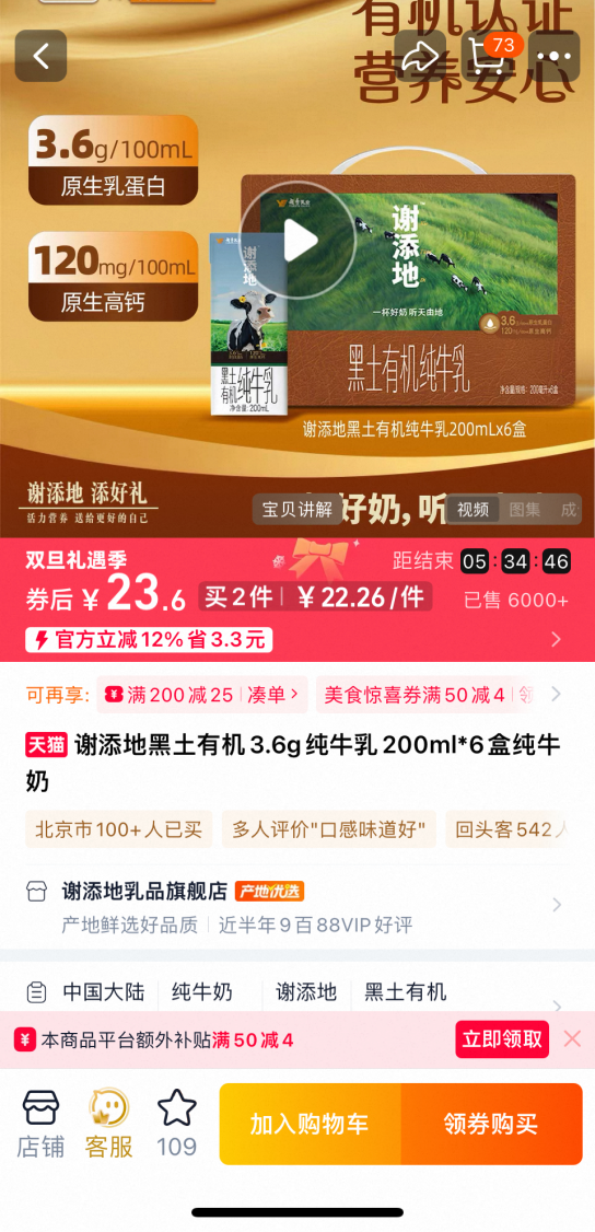 与此同时,谢添地最初的高端产品在部分渠道也出现了降价促销。天猫超市显示,黑土娟姗纯牛乳单瓶价格降至9.5元,优惠3.3元;黑土A2β酪蛋白纯牛乳(250ml×10瓶)售价62.55元,单瓶6.3元,优惠1.5元。