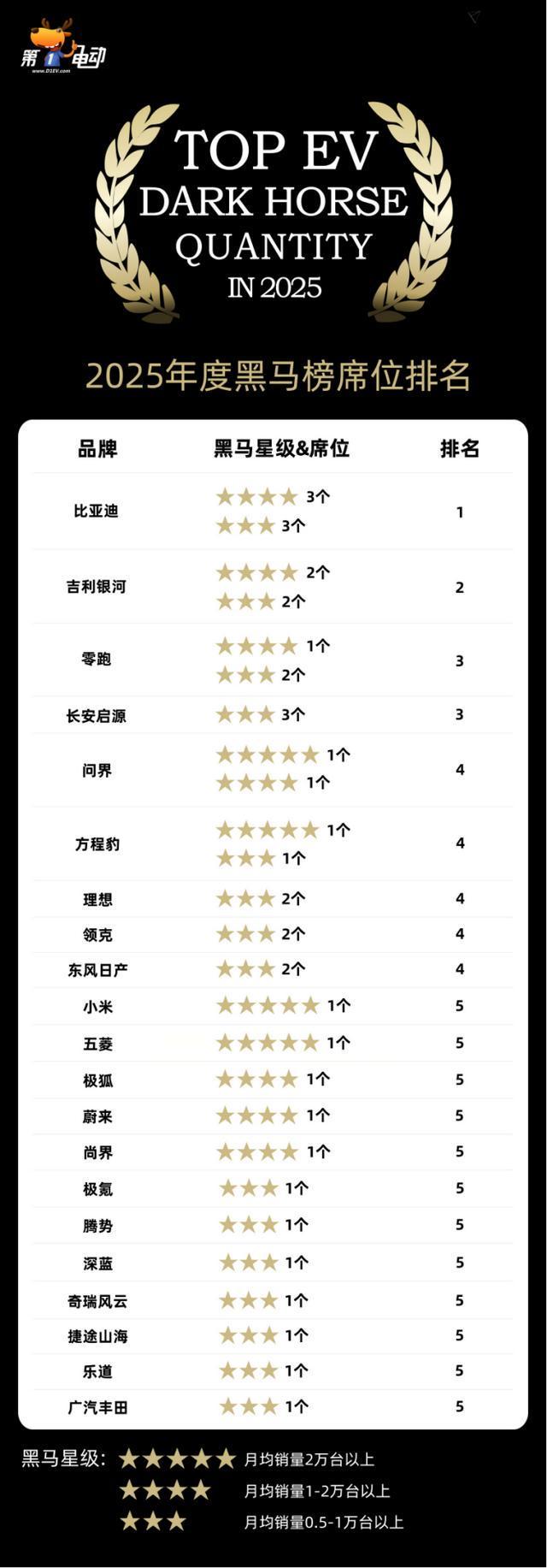 终端成绩如何?2025年,零跑推出了B10、B01、Lafa5在内的多款全新车型以及C16、C11、C10等改款版本,在2025新能源汽车黑马榜上,旗下就有B10、B01、Lafa5共三款新车上榜,成为了继比亚迪、吉利银河之后,2025年度黑马榜席位第三名。