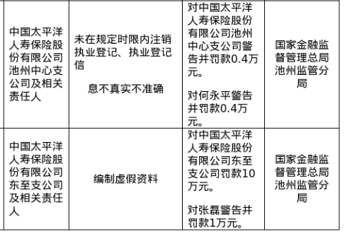 太平洋人寿东至支公司遭罚十万,池州中支被罚款四千元