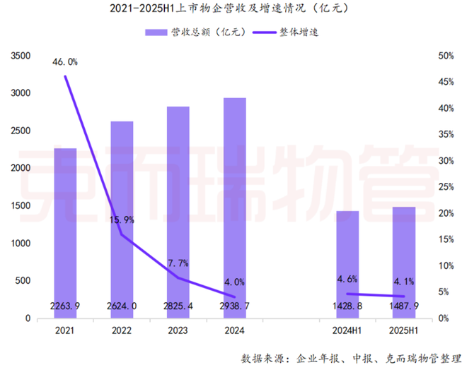 根据克而瑞物管数据,2025年上半年,63家上市物企营收总额增长至1487.9亿元,同比增长4.1%,增速较去年同期下滑0.5 个百分点;毛利润均值为4.6 亿元,同比下降2.0%。