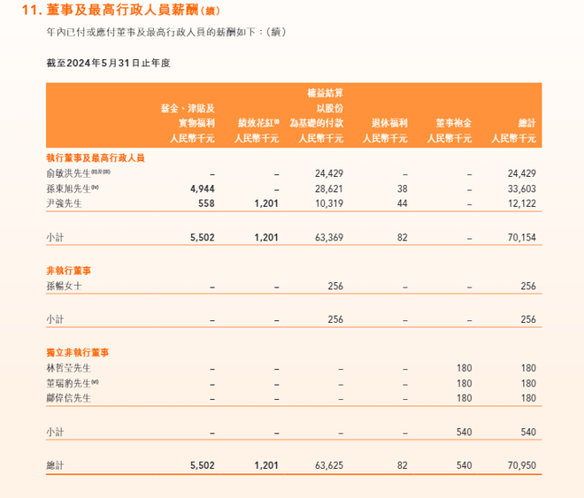 公司在今年9月公布的2025年年报中表示,孙东旭于2023年12月16日辞任行政总裁。所披露的孙东旭薪酬仅涵盖2023年6月1日至2023年12月16日期间。据公司公告,孙东旭获得的薪酬总计3360.3万元,其中薪金、津贴及实物福利达494.4万元,权益结算2862.1万元,退休福利3.8万元。