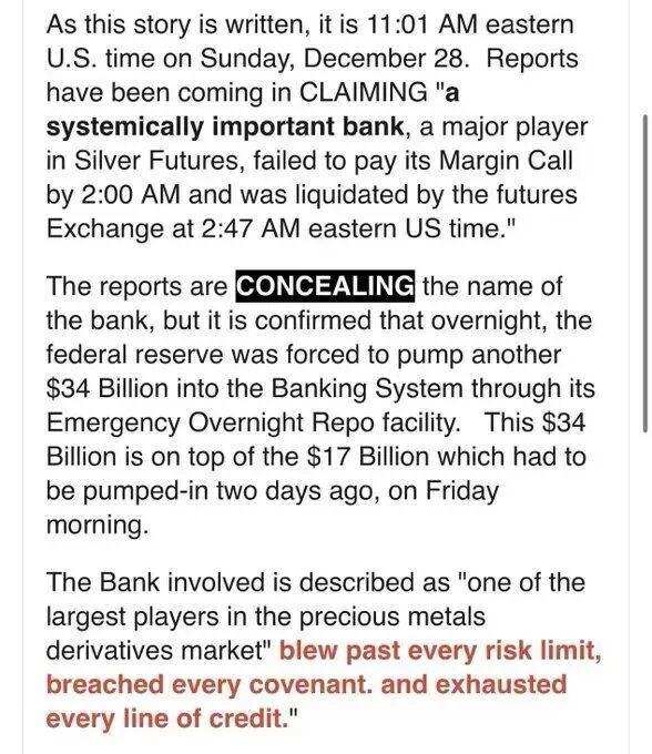 本周伊始,一张惊人的截图在X平台以每小时数百条的传播速度在投资圈内中疯传,其宣称的骇人内容——一家“系统重要性”银行白银爆仓濒临破产、交易所深夜强制平仓、美联储据称被迫向系统注入数十亿美元资金,挑动着每一根金融敏感神经。