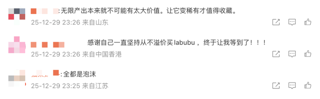 对于Labubu二手市场降温,有网友认为有涨有跌,很正常;有的直言稀有的才值得珍藏;还有网友认为“五折也贵了”。