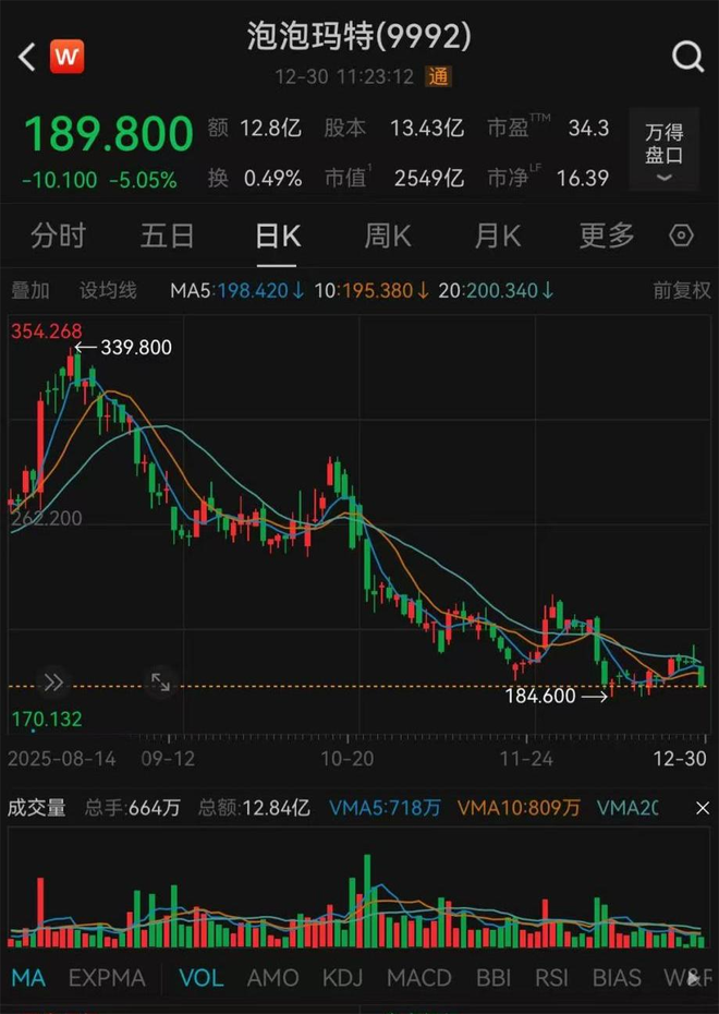 股价方面,12月30日,泡泡玛特港股开盘震荡下跌,截至发稿,报189.8港元/股,与今年8月339.8港元/股的高位相比,跌幅超40%,市值蒸发超2000亿港元。