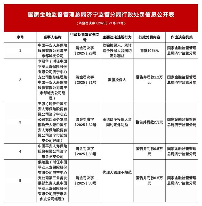 针对上述违法违规行为,国家金融监督管理总局济宁监管分局对其罚款10万元;对时任中国平安人寿保险股份有限公司济宁中心支公司副总经理兼济宁市邹城支公司经理李冠华,警告并处罚款1.2万元;对时任济宁中心支公司第四业务发展部负责人兼济宁市邹城支公司经理王强,警告并处罚款2万元。