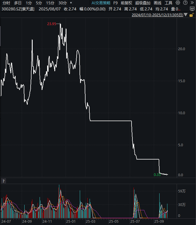 2025年4月被证监会立案调查后,股价开启持续阴跌;6月交易所出具退市预告知书,复牌后遭遇12个连续跌停;7月进入退市整理期,15个交易日内股价从9.5元跌至0.33元,跌幅超96%。