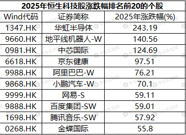 恒生科技指数成分股中,半导体表现最为出色,华虹半导体年内大涨超240%领涨科指,中芯国际则累计涨超120%。人形机器人行业也备受关注,地平线机器人概念股年内涨140%。互联网巨头中,阿里年内涨超76%,小鹏汽车涨超70%,百度涨59.01%。