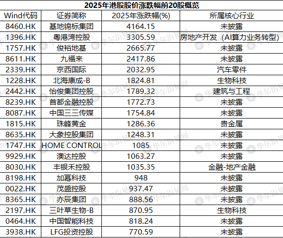 从牛股分布来看,赛道聚集效应清晰可见。硬科技与AI转型赛道中,粤港湾控股凭借AI算力基础设施布局及与华工科技的战略合作,年内累计涨幅达33.05倍。生物医药板块,"罕见病第一股"北海康成涨幅超18倍,三叶草生物等涨幅也达到8倍以上。贵金属板块则受益于全球金价创新高,珠峰黄金年内涨幅达12倍。