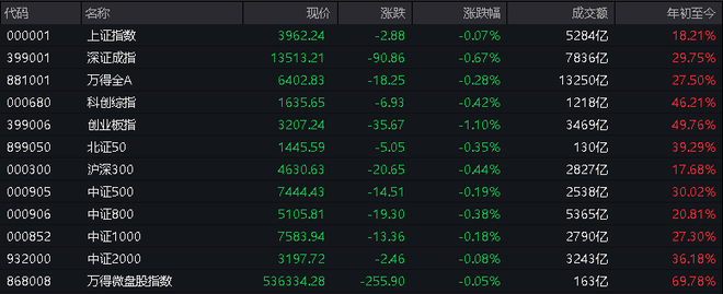 12月31日,A股截至午间收盘,沪指跌0.07%,深成指跌0.67%,创业板跌1.1%。盘面上,个股跌多涨少,沪深京三市超3000股飘绿,上午半天成交1.33万亿。具体来看,AI应用端再度大涨,蓝色光标、南兴股份等多股涨停。商业航天概念延续强势,航天晨光、北斗星通等近10股涨停。 长鑫存储概念表现活跃,合肥城建、上峰水泥等涨停。下跌方面,液冷服务器概念下挫,川润股份跌超8%。以下是核心指数情况: