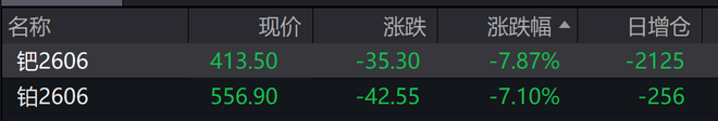 广期所铂期货跌超7%,钯期货跌超6%。沪银期货涨超2%。