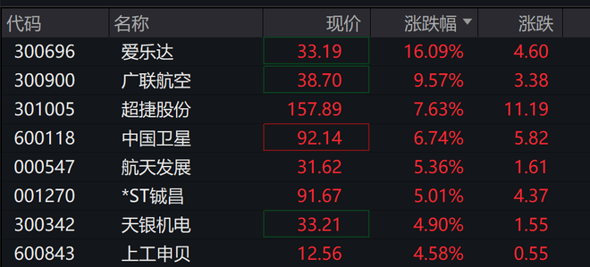 商业航天概念再度走强,泰尔股份5连板,雷科防务、宏英智能、顺灏股份涨停,太力科技涨超10%,广联航空、信维通信、烽火通信、乾照光电等跟涨。![]()