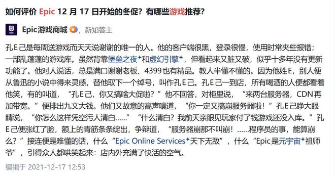 知乎上,Epic也常常亲自下场。像2021年圣诞前后,他们就把自己改成了鲁迅笔下的孔乙己。