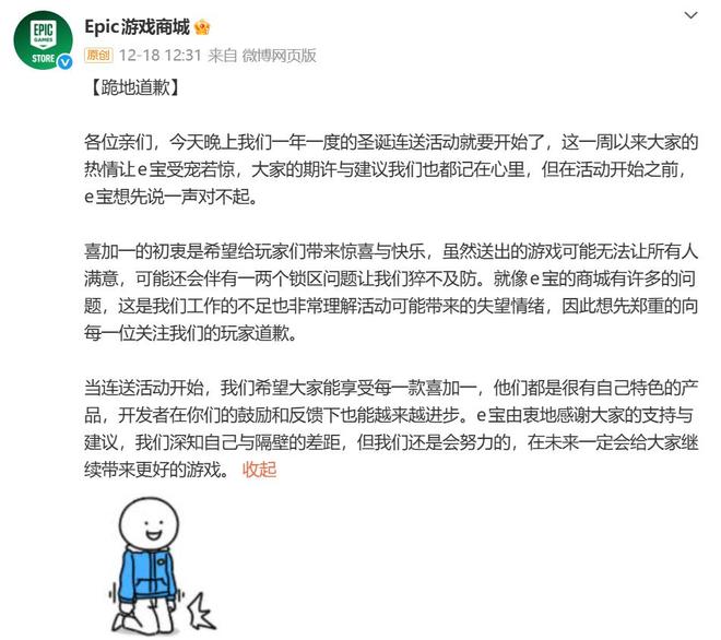 离谱的是,在TGA上买广告位花钱吆喝,甚至都还不是Epic的极限。12月18日,Epic官方预热圣诞连续送游戏时,还提前给大家表演了一个当众滑跪,大意基本相当于「送出的游戏偶尔可能出现锁区、小众等不能令所有人满意的情况,这是E宝工作上的失误,对不起」。