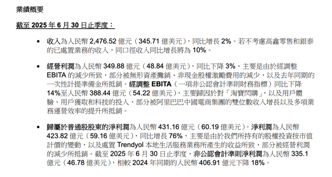 8 月 29 日,阿里巴巴对外公布 2025 年第二季度财报。当季阿里巴巴营收 2476.52 亿元,同比增长 2%。剔除出售高鑫零售及银泰业务影响,当季阿里巴巴同口径收入同比增长 10%。