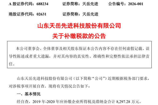 天岳先进需补缴所得税及滞纳金共计8297万元,这将导致公司2025年度净利润相应减少,公司正在进行自查补交工作,以确保财务合规,这一调整反映了公司在财务管理上的透明度和责任感,同时也提醒了企业加强财务管理的重要性。