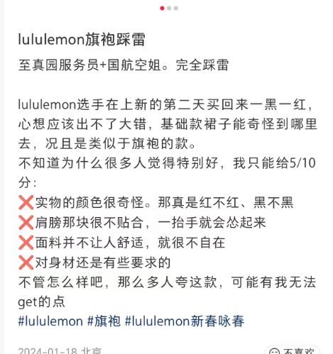 比如,Lululemon一款售价980元、设计类似旗袍的中长款连衣裙也曾在社交媒体上引发热议。