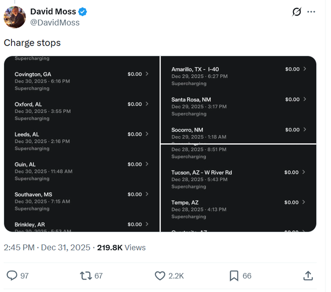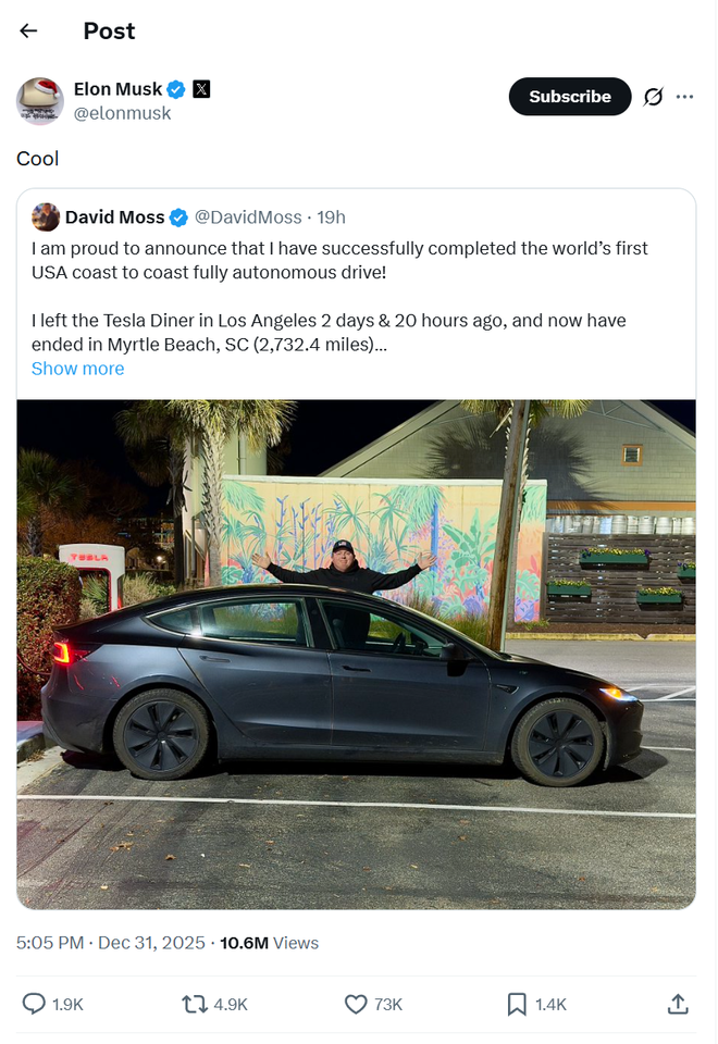 Moss从洛杉矶的特斯拉餐厅出发,最终抵达南卡罗来纳州默特尔比治,全程使用FSD v14,没有任何形式的人工接管。