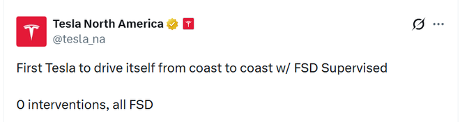 马斯克本人在第一时间转发祝贺。值得一提的是,这条路线,正是马斯克自2016 年 Autopilot 2.0发布以来反复提及、却始终未能兑现的目标。当年他曾预计,特斯拉可以在2017年实现“海岸到海岸”的自动驾驶。现在回头看,这个目标并非不可能。