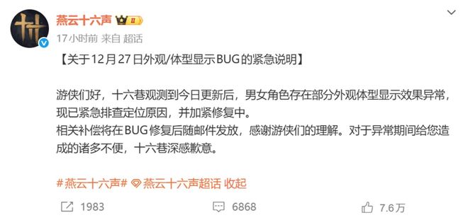 面对此次争议,《燕云》快速道歉,12月27日,@燕云十六声发文道歉,发布关于12月27日外观/体型显示BUG的紧急说明: