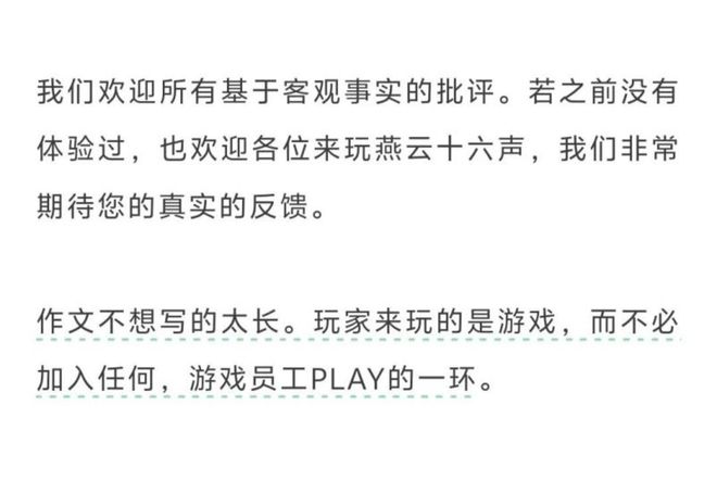 回顾《燕云》这一年争议不断,或许成绩越多,伴随的争议也越多,官方也曾说“玩家来玩的是游戏,而不必加入任何,游戏员工PLAY的一环。”