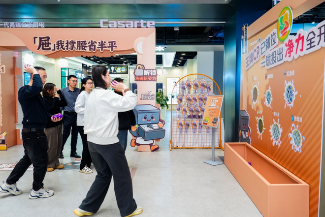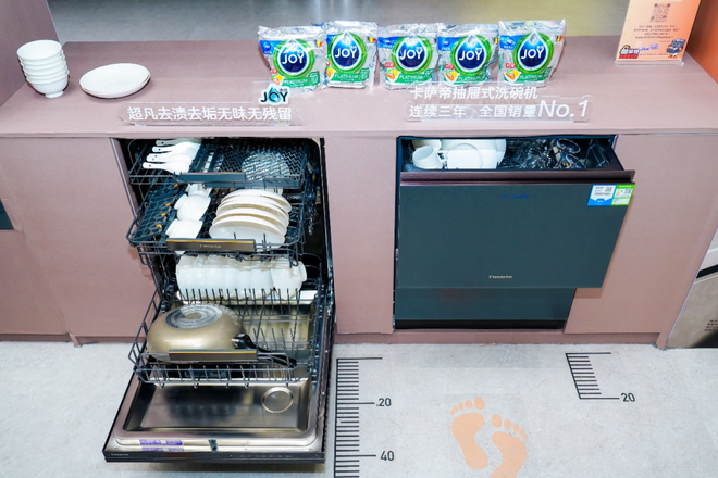 在活动现场的“净实力展示区”,人们通过轻松有趣的互动,直观理解了卡萨帝抽屉式洗碗机与宝洁JOY洗碗凝珠如何协同工作,共同为用户构建从“空间解放”到“洁净守护”的完整厨房生态。