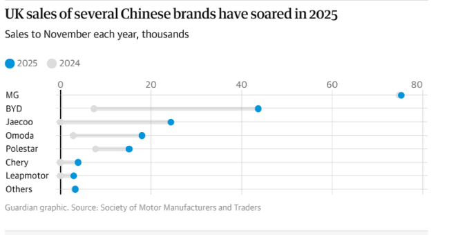 这也就意味着,2025年英国售出的每十辆新车中就有一辆来自中国品牌。
