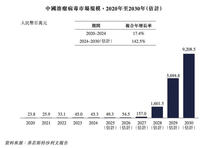 弗若斯特沙利文报告显示,2024年全球溶瘤病毒市场规模约为8710万美元,中国市场约为4530万元人民币,基数依然很小。真正的行业爆发预计要到2028年之后,到2030年,全球市场规模有望攀升至75亿美元,中国市场也可能增长至92亿元人民币。