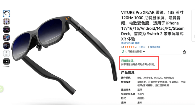 市象观察线上销售平台发现,截至12月27日,在亚马逊德国站点搜索"VITURE Pro"显示"目前缺货,尚不清楚何时会再次到货",但Luma系列产品仍在售。同时VITURE Pro、Luma系列在亚马逊欧洲其他地区均处于在售状态。