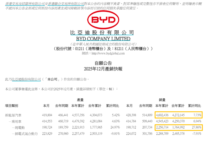 在全年460.2万辆的销量中,纯电动乘用车(BEV)销量达到226万辆,同比大增28%。对比特斯拉,虽然该公司尚未披露全年电动车销量,但它在周一发布的分析师一致性预期显示,其2025销量将同比下降8%至164万辆。