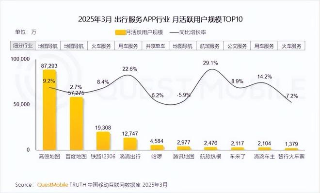 QuestMobile发布的数据显示,截至2025年3月,高德地图的月活为8.73 亿,彼时其月活数量仅次于微信、淘宝和支付宝。