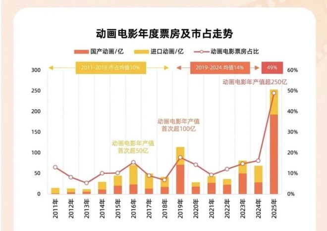 不过,电影行业在挑战之中亦有亮点。今年电影市场最显著的特征,莫过于动画电影的集体爆发。从年初的《哪吒之魔童闹海》到年末的《疯狂动物城2》,不同题材与风格的动画电影接连引发市场热烈反响,为全球电影产业带来了一抹亮色。灯塔发布的《2025中国电影市场年度盘点报告》显示, 2025年全年动画电影总票房突破250亿元,贡献大盘半数票房,创历史新高。