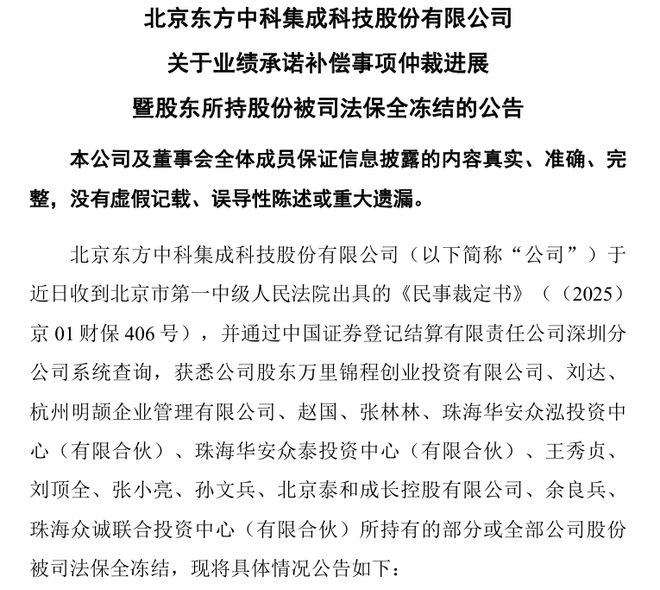 东方中科业绩承诺补偿仲裁进展,股东持股遭冻结,总股本两成受影响