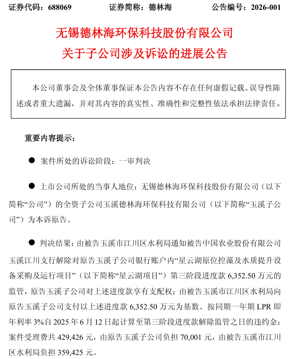 1月4日晚间,德林海(688069)披露了子公司诉讼进展公告,其全资子公司玉溪德林海环保科技有限公司(简称玉溪子公司)诉玉溪市江川区水利局等相关案件获一审判决支持。