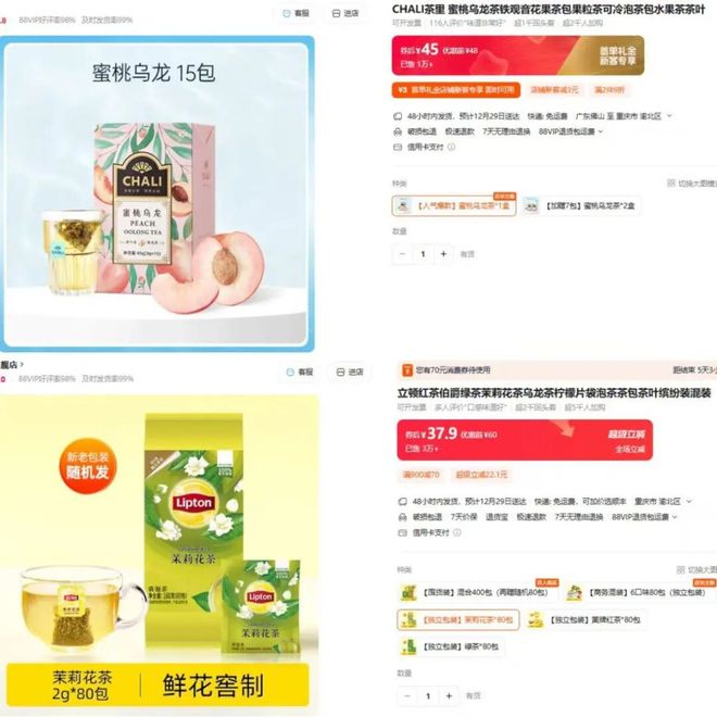CHALI明星单品蜜桃乌龙袋泡茶、立顿茉莉花茶袋泡茶 图片来源:天猫平台