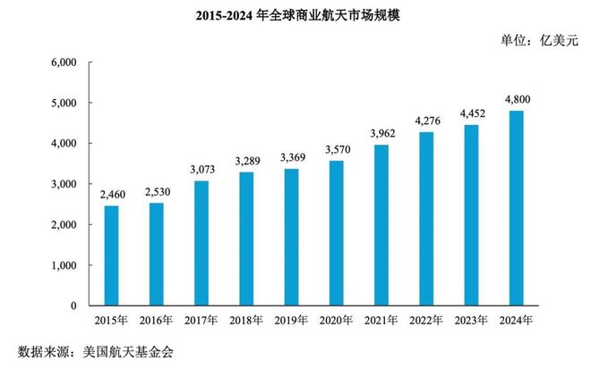 美国航天基金会2025年发布的《航天报告》显示,2024年全球航天经济规模已经达到6120亿美元,其中商业航天收入为4800亿美元,占比78%。