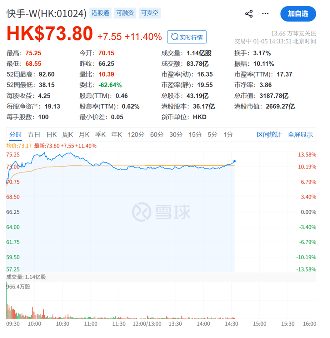 快手股价大涨12%,其中可灵海外表现突出,其Motion Control玩法正在海外社交媒体上广泛传播并受到热捧,成为出圈之作,这一玩法创新且具有吸引力,促使快手在海外市场的知名度和影响力进一步提升。