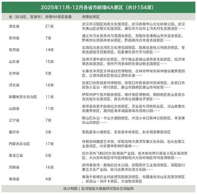 过去两个月,山西、贵州、甘肃、山东、河北、河南、吉林等14个省、市,相继公布新一批国家4A级旅游景区名单,合计新增154家。从节奏上看,这更像是一场集中完成的年度工程,也让“4A景区密集上新”在年底成为业内高频话题。