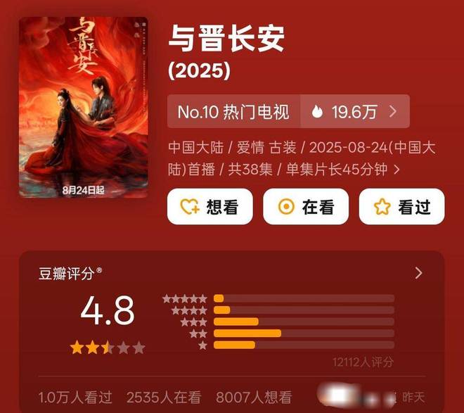 截至9月7日,超点完结的《与晋长安》,创下今年古偶大剧最低评分——豆瓣4.8分。这也是今年第二部口碑扑街的女将军题材古偶长剧。
