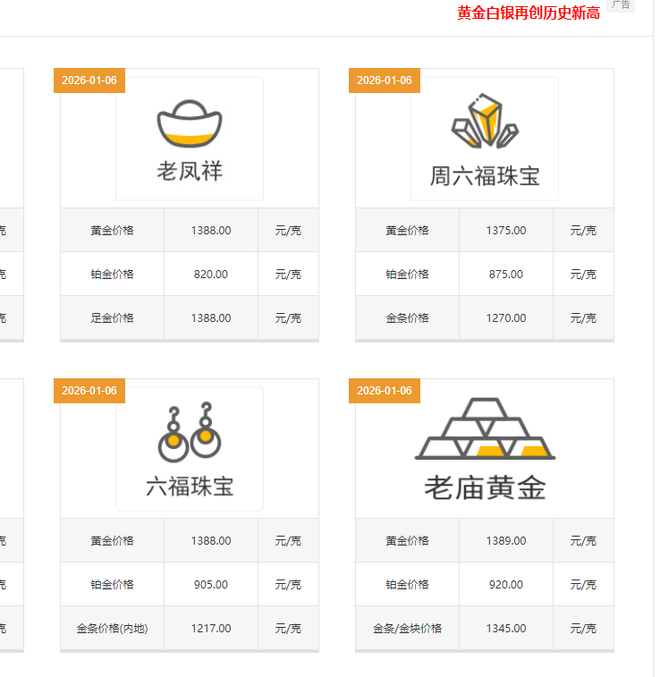 1月6日,记者走访各品牌金店发现,周六福、老庙黄金、老凤祥的足金饰报价分别为:1375元/克、1389元/克、1388元/克,各主要黄金品牌价格日均涨幅超12元,金价集体站至1375元/克以上。