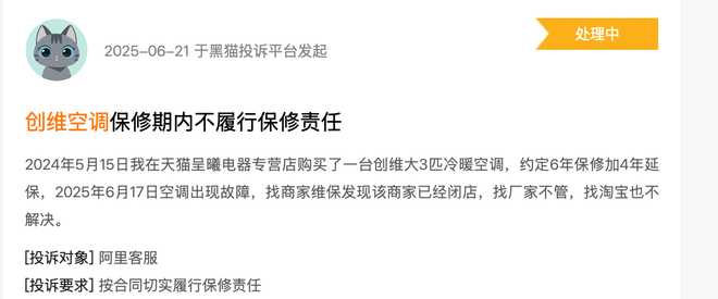 然而,转型的阵痛在企业基本面上逐渐显现。在黑猫投诉平台上,关于创维空调的投诉涉及保修期内拒修、产品异味、故障及售后推诿等多方面问题。