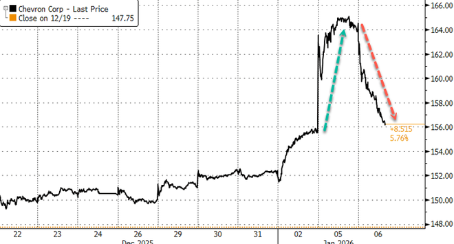 在美股市场,虽然雪佛龙、ConocoPhillips和ExxonMobil的股价周一因政权更迭的消息一度跳涨,但在周二的交易中,随着市场开始重新评估长期复苏的复杂性,雪佛龙回吐了大部分涨幅。