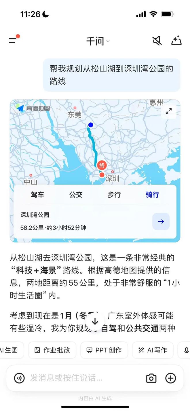 这种"中央调度、地方响应"的架构,实际上是想撬动阿里整个生态。12月18日,千问APP已正式接入高德地图,利用高德的实时交通数据和超2亿POI数据库,实现地理空间理解与可视化决策卡片服务,用户可一键导航或打车。