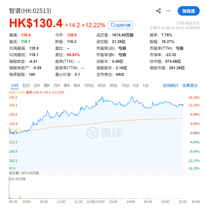 1月8日,智谱正式在港交所主板挂牌上市,发行价定为116.2港元。尽管开盘一度破发,但股价随后迅速回升并转涨,盘中一度涨超10%。截至发稿时,智谱股价报130港元,涨幅12%,总市值达574亿港元。本次IPO香港公开发售部分获超1159倍认购,显示出零售投资者对这一稀缺AI标的的高度热情,国际发售部分亦获逾15倍认购。