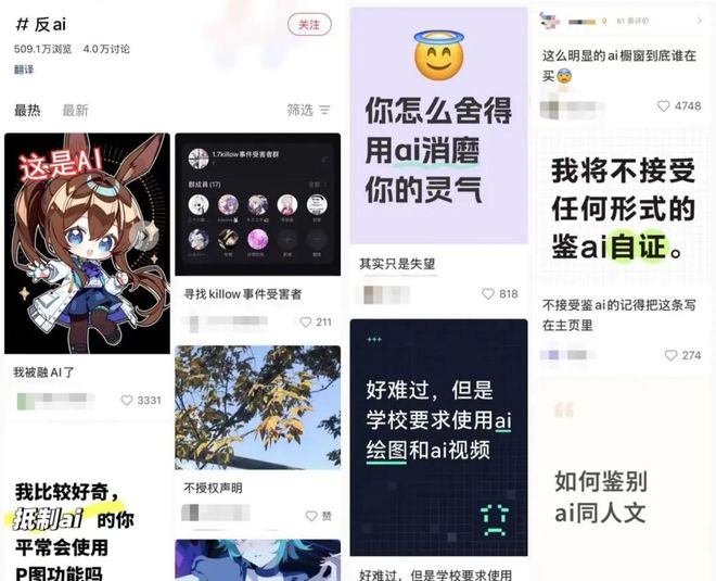 AI对内容的腐化不再只是口中的担忧,越来越多的人看见了摆在眼前的证据。韩艺秋的帖子里加上了#反ai 标签,截止目前,该标签在平台有509.1万浏览、4.0万条讨论,在AI被广泛高歌的时刻,有一群人正在与AI对抗。