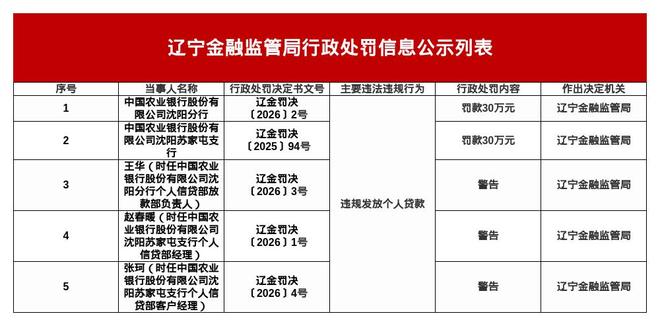 中国农业银行股份有限公司沈阳苏家屯支行也因违规发放个人贷款,被罚款30万元。