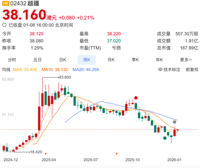受此消息影响,越疆科技股价在公告后大涨13.45%。公司股价在2025年曾创下83.8港元/股的高点,截至2026年1月8日收盘价为38.16港元/股,总市值达到167.89亿港元。