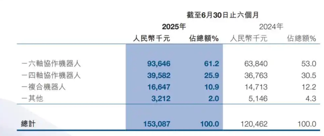 财报显示,2025年上半年,六轴协作机器人实现收入9365万元,同比增长46.7%,占总营收比重已攀升至61.2%,成为绝对的营收主力。