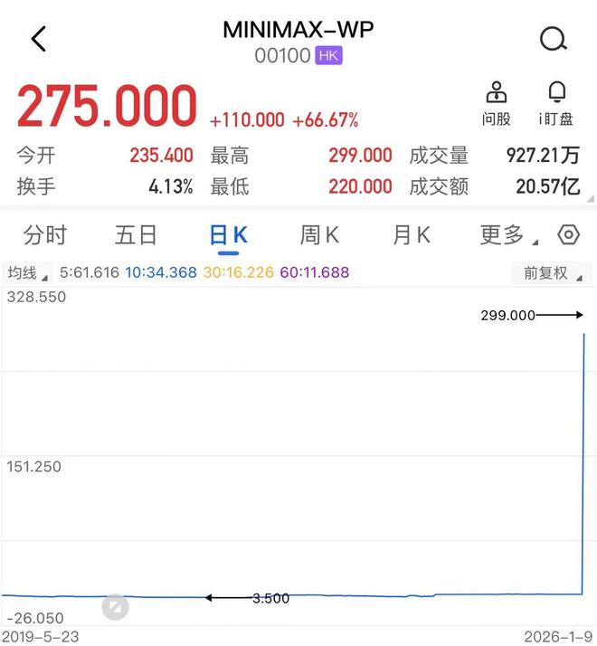 凤凰网财经讯 1月9日,大模型企业MiniMax在港交所上市,开盘大涨42.67%,报235.4港元,公司总市值突破700亿港元。截止发稿,MINIMAX股价涨幅扩大至66%。